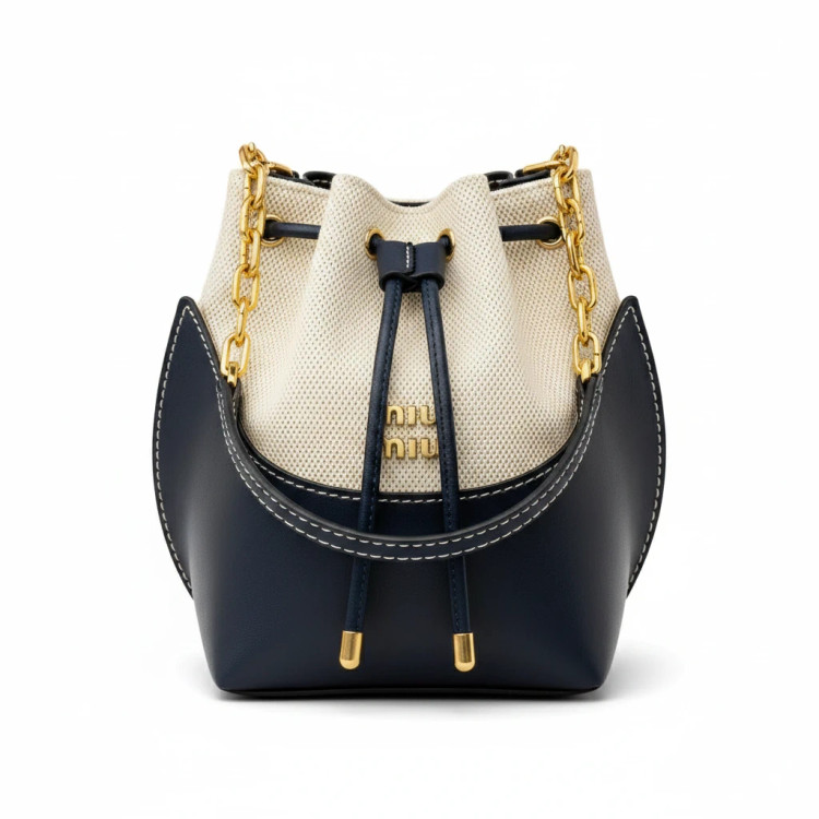 کیف وارداتی دوشی سرمه ای زنانه مدل Bucket Chain Drawstring با طراحی ترکیبی چرمی و برزنتی(کد761)