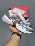 در ساخت Nike V2K سفید قهوهای از ترکیب مش تنفسپذیر و چرم مصنوعی باکیفیت استفاده شده است. این ترکیب چندلایه علاوه بر زیبایی ظاهری، باعث افزایش دوام و راحتی کفش میشود.